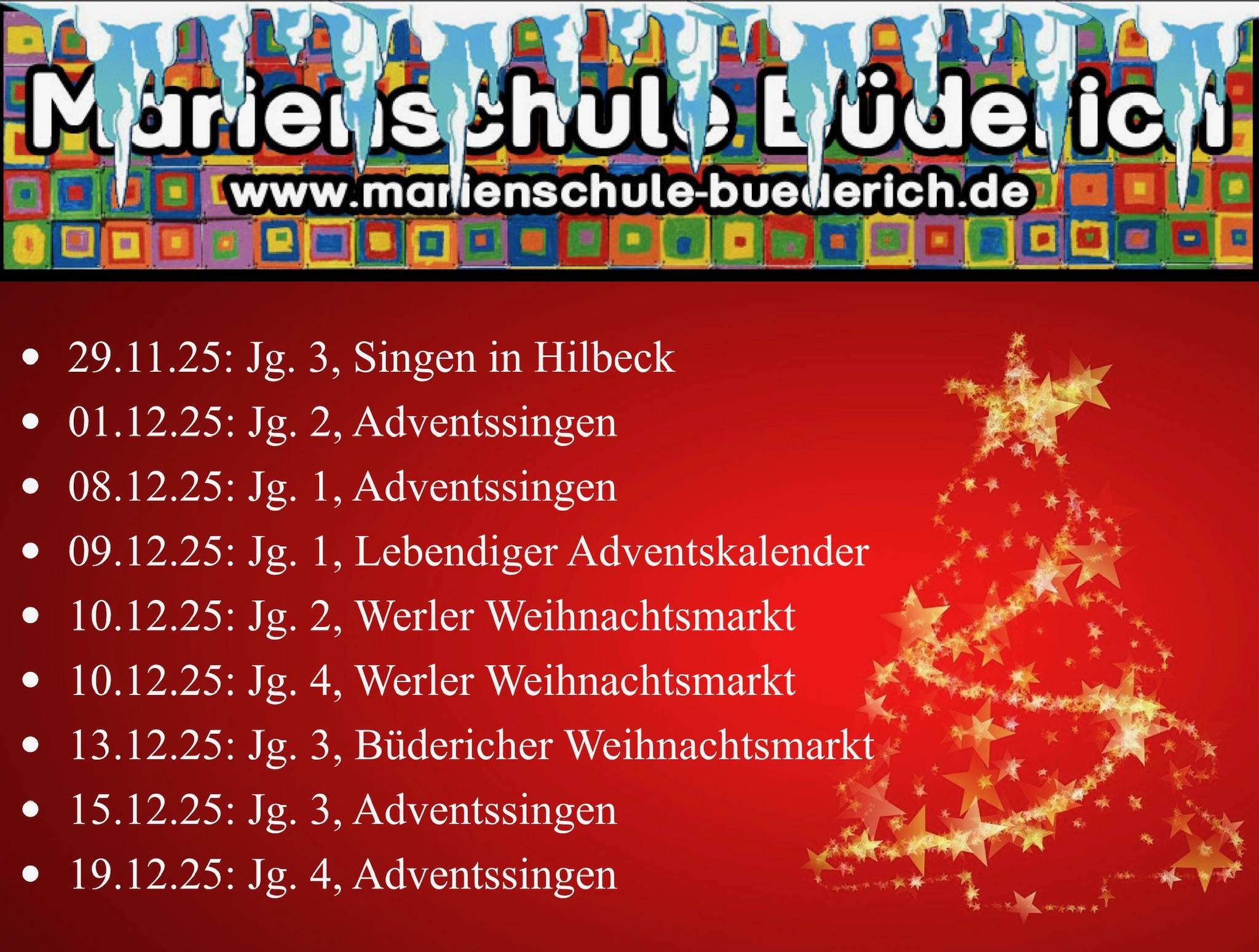 Singen im Advent In der Adventszeit sind wir wieder mit vielen musikalischen Aktionen unterwegs. Wir singen in Hilbeck, auf dem Büdericher Weihnachtsmarkt, auf dem Werner Weihnachtsmarkt und in der Schulzeit („Lebendiger Adventskalender“ oder wöchentliches Adventssingen). Es macht uns stolz, dass