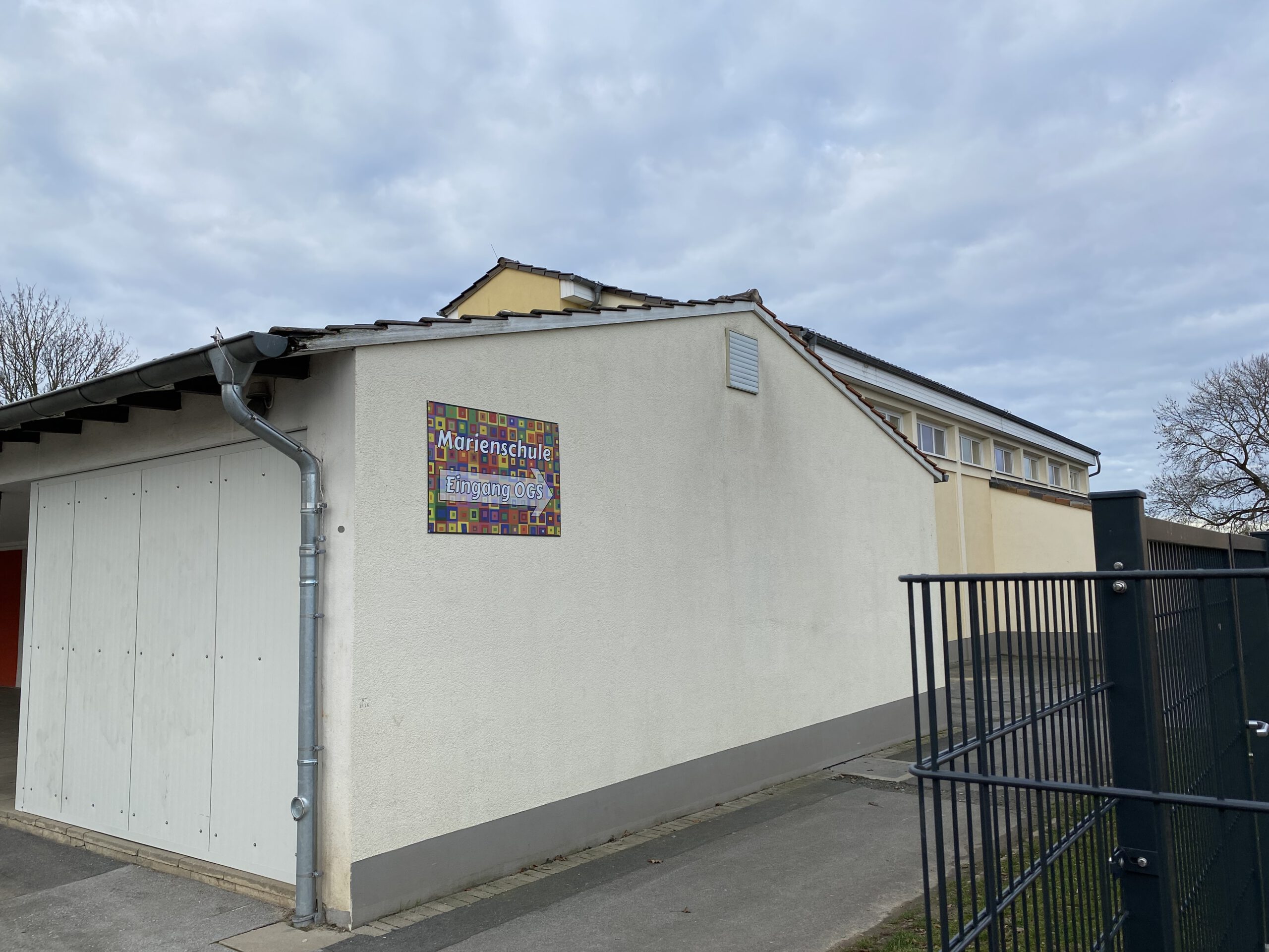 Neue Beschilderung für unsere OGS Unsere OGS hat neue Wegweiser bekommen. Suchende können den Eingang zurm OGS Gebäude jetzt leichter finden. Ein großes Schild zeigt ab sofort Eltern, Großeltern, Zulieferern und Gästen den richtigen Weg zu unserer OGS. Jetzt muss