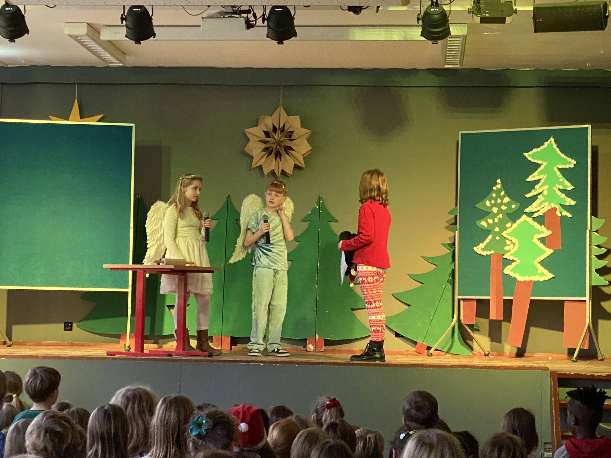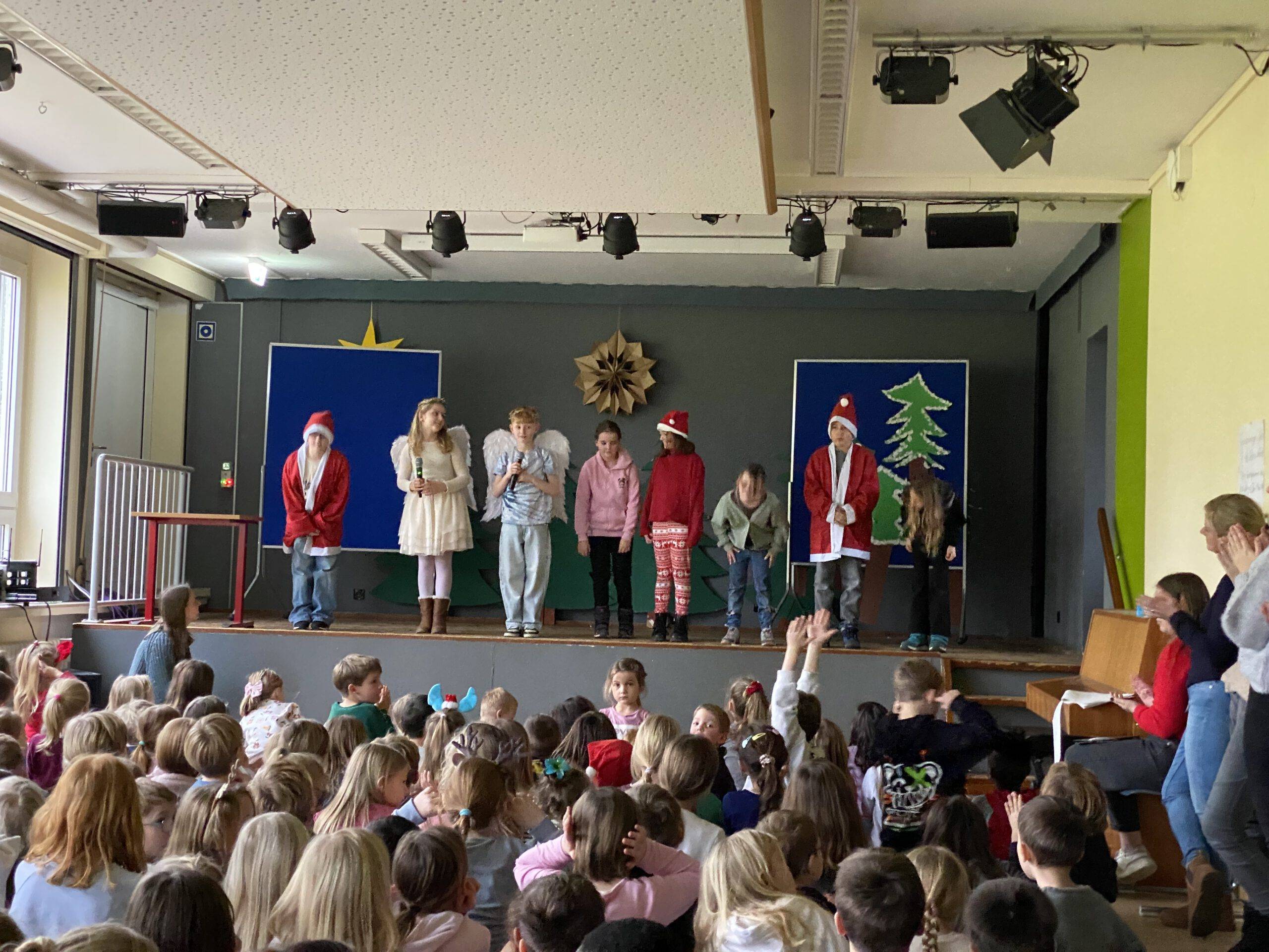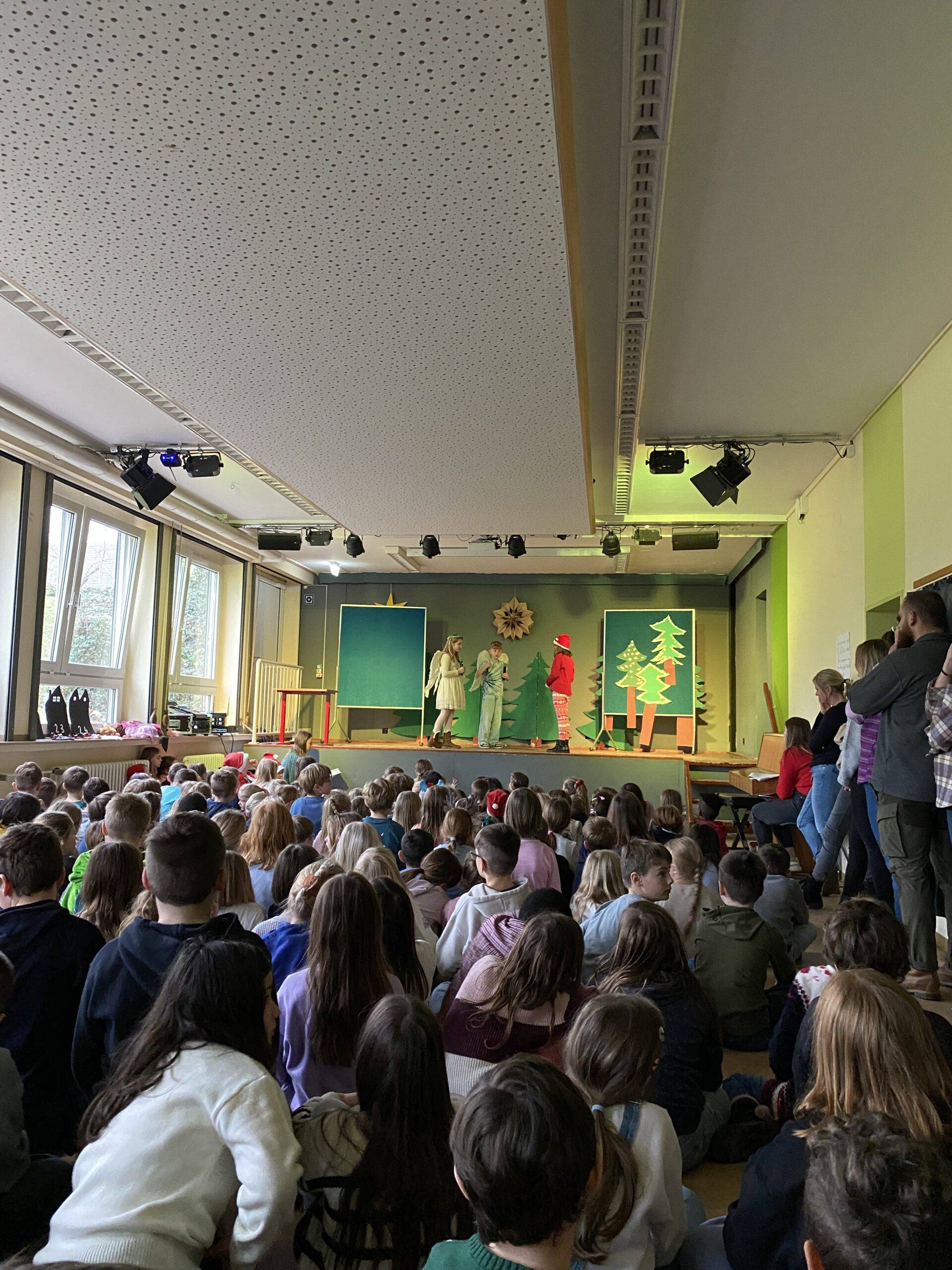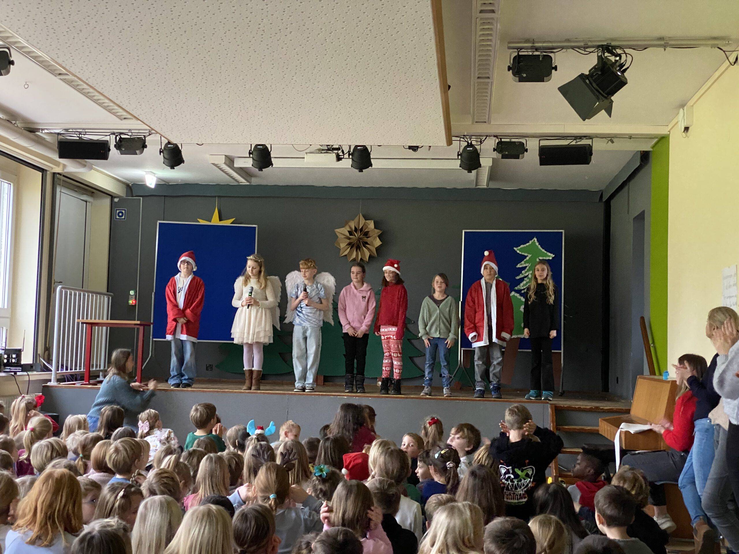 Am Freitag vor den Ferien gaben dann noch einmal die vierten Klassen einige Lieder zu Besten und die schuleigene Theater-AG führte unter der Leitung von Fr. Rüter und Fr. Utke ein modernes Weihnachtsstück auf. Zum Abschluss sangen alle Kinder und Erwachsenen das Lied „Alle Jahre wieder“ – ein absoluter Gänsehautmoment!!!