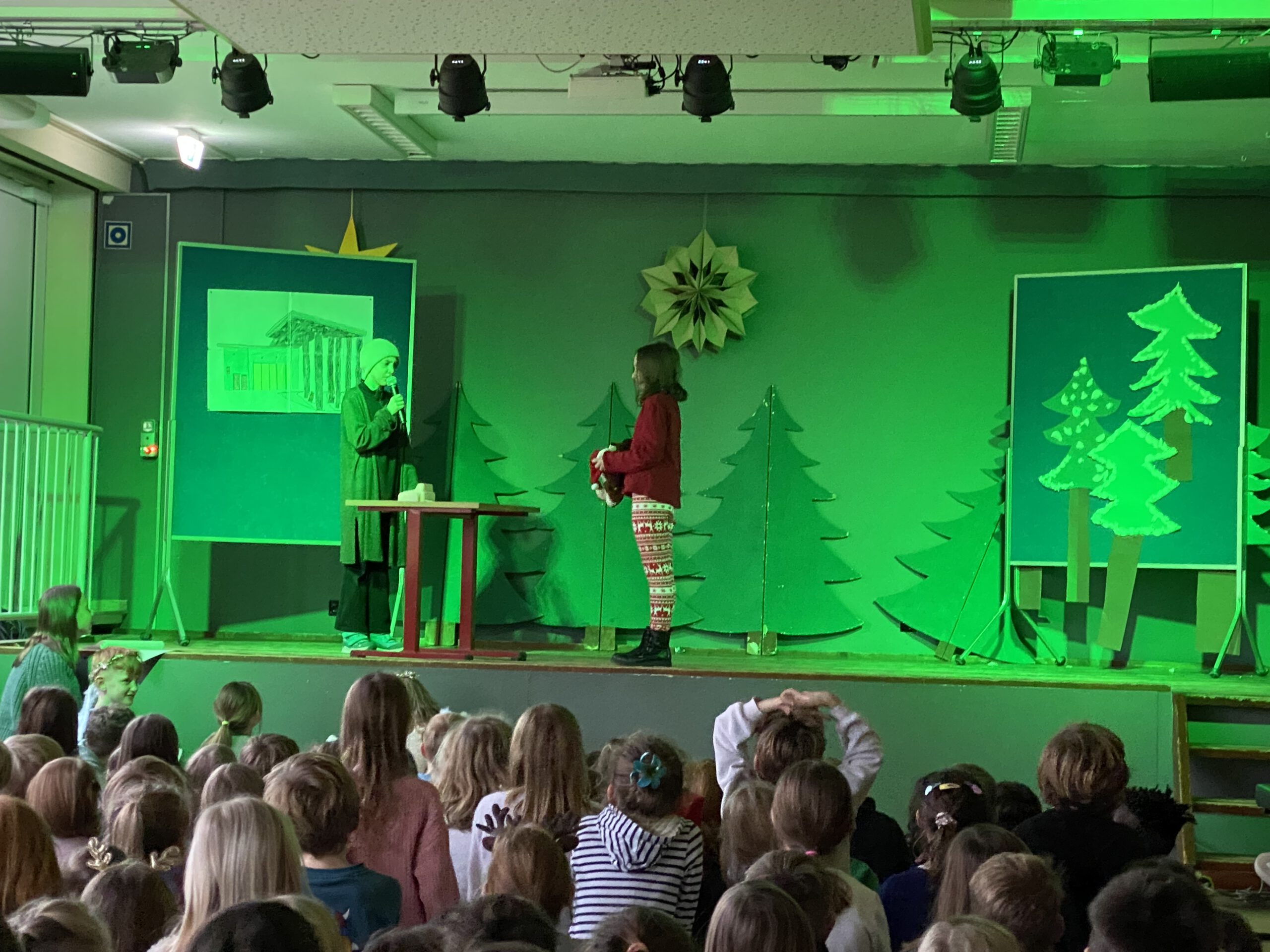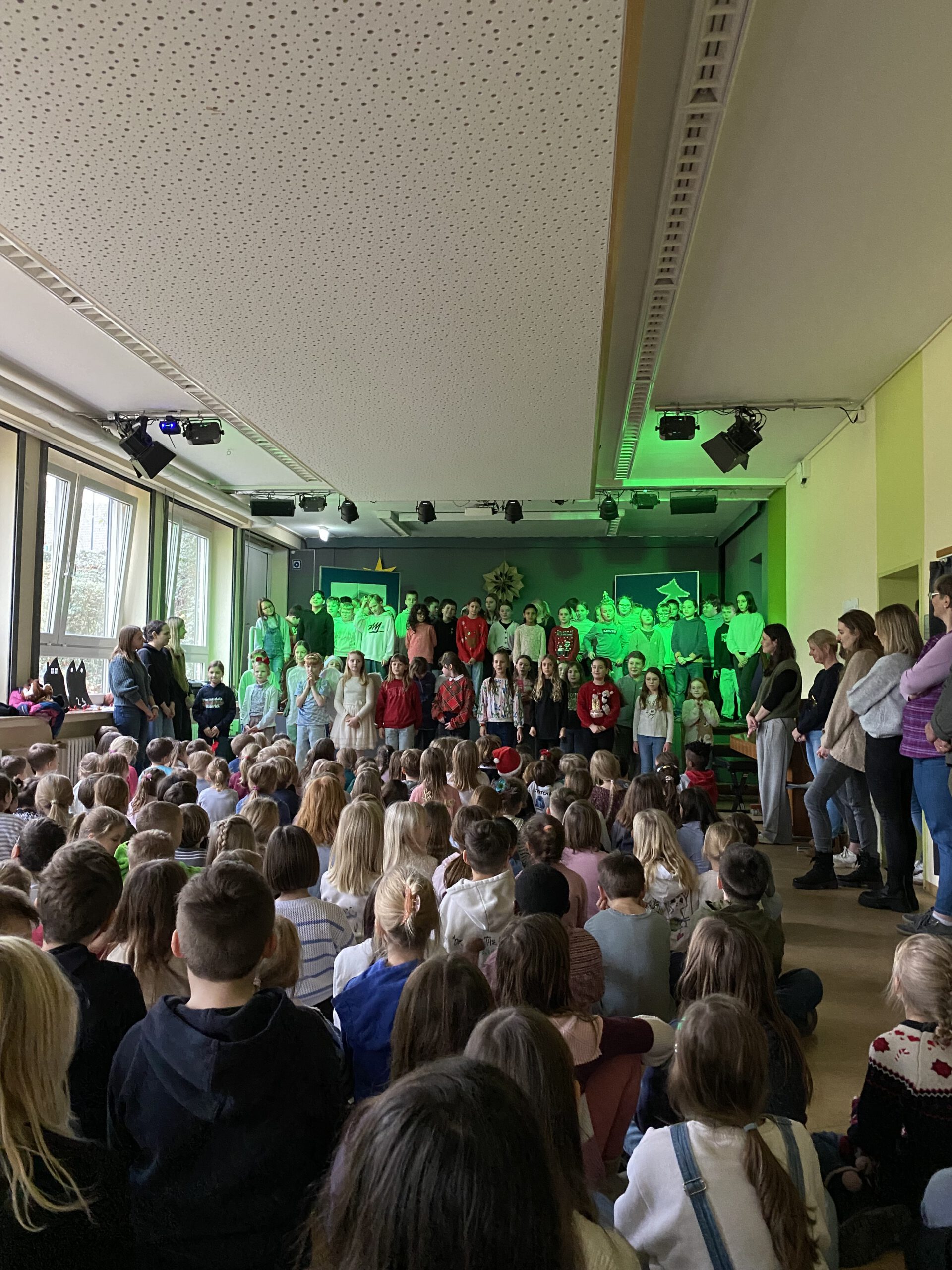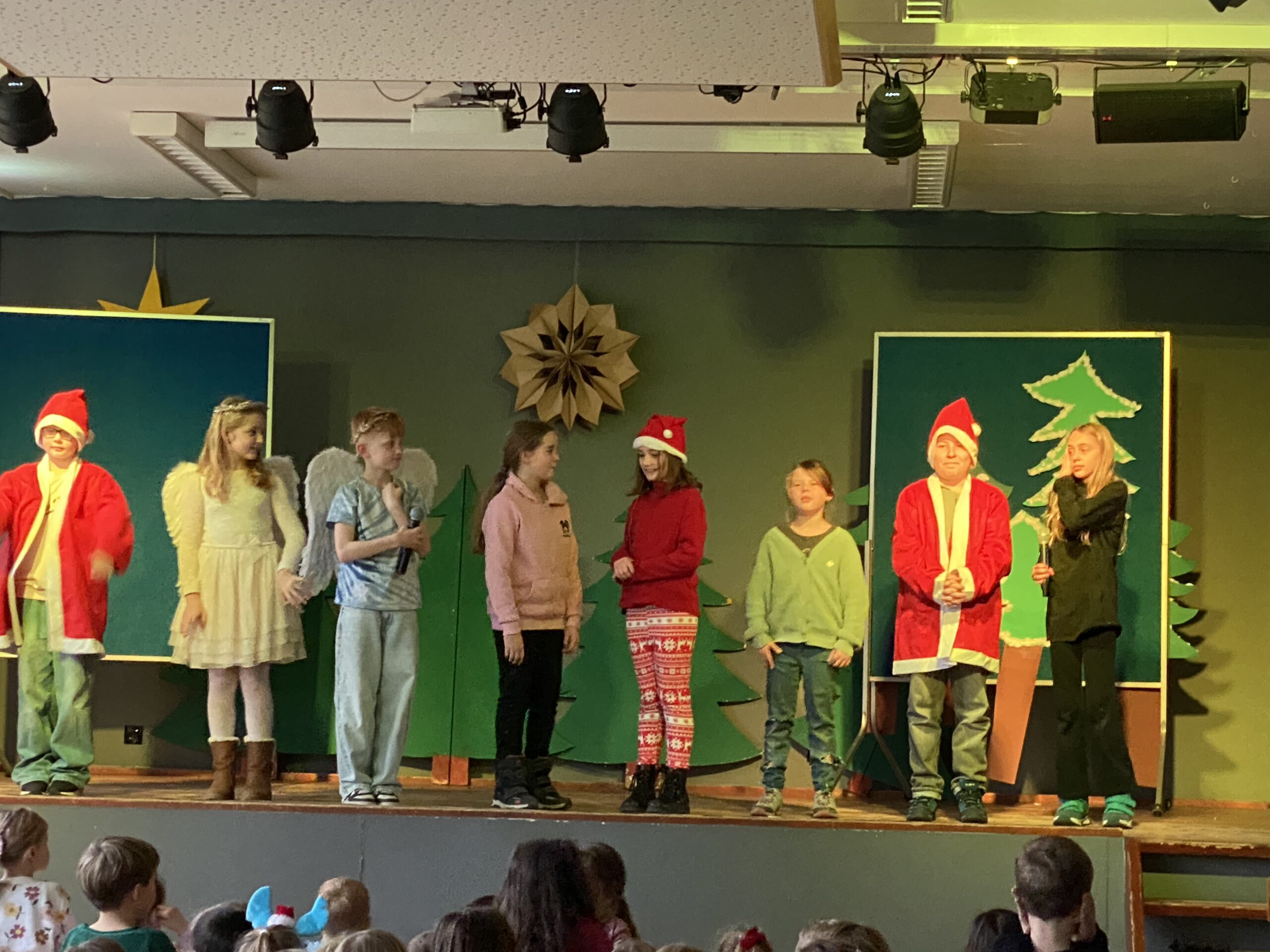 Am Freitag vor den Ferien gaben dann noch einmal die vierten Klassen einige Lieder zu Besten und die schuleigene Theater-AG führte unter der Leitung von Fr. Rüter und Fr. Utke ein modernes Weihnachtsstück auf. Zum Abschluss sangen alle Kinder und Erwachsenen das Lied „Alle Jahre wieder“ – ein absoluter Gänsehautmoment!!!
